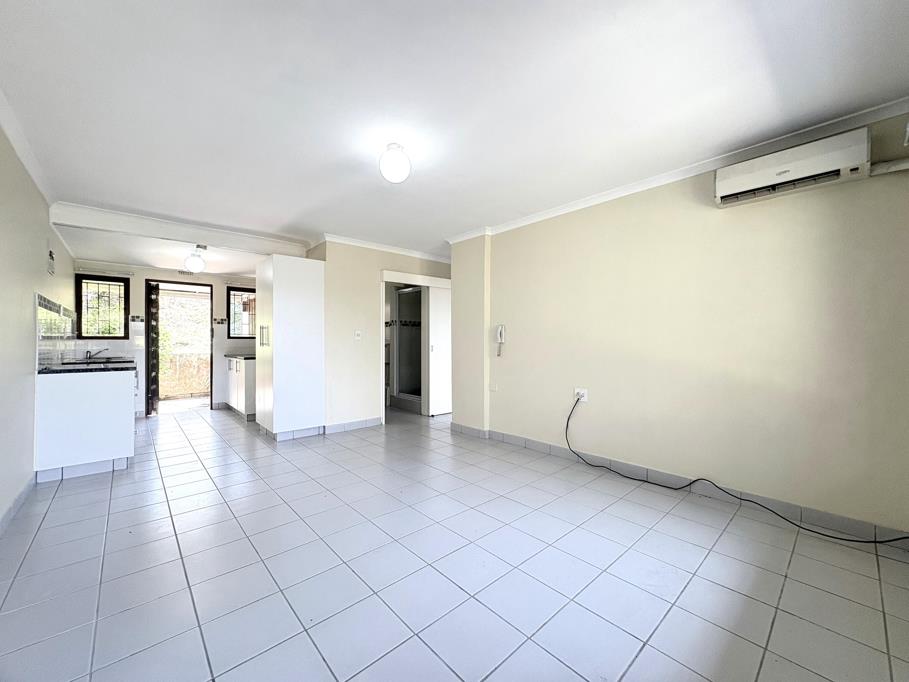 Open plan lounge kitchen with brand new built-in cupboards and countertops in the kitchen.