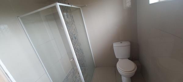 The bathroom has a shower , toilt and a hand basin.