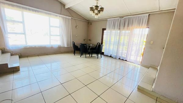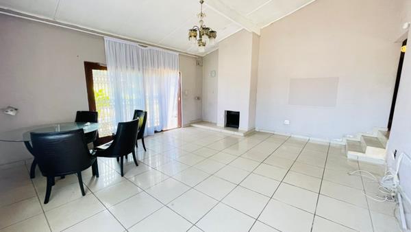 A spacious open-plan lounge and dining room, both with tiled floors and a chandelier. The lounge features two doors the main door leading outside and a sliding door with a large window that brings in plenty of natural light. There is also a cozy fireplace perfect for winter evenings.