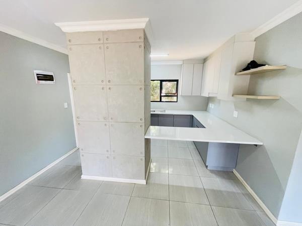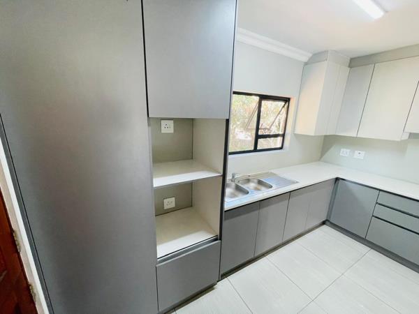 Enjoy a modern, fitted kitchen that features sleek cabinetry and countertops. Although there is no stove included, the kitchen is well-equipped for your cooking needs and offers a stylish space for meal preparation.