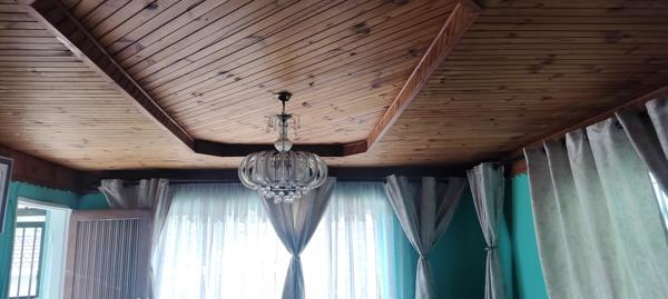The lounge is adjacent to the dining room which has a wooden ceiling and a chandelier.
