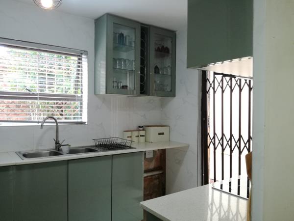Back downstairs, a sliding door from the lounge leads out to a covered patio and a quiet, private garden area where one can relax with family and friends on warmer days. There is also a sizeable walled courtyard area outside the kitchen where you can hang the laundry, and even store your braai and more.