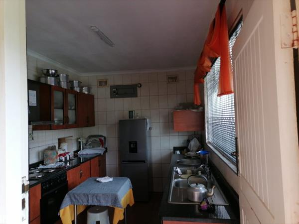 The large kitchen has brown cupboards and black granite tops. It has Defy built in stove with oven and extractor fan.