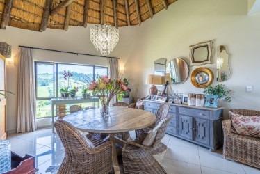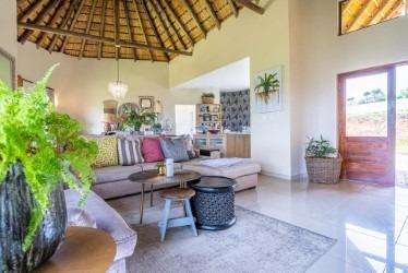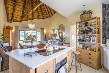 The high, vaulted thatched ceilings create an airy, inviting atmosphere, inviting loads of natural light. The modern kitchen is a real highlight, featuring a large island with a built in hob, ample counter space, and a convenient pantry scullery. This modern property offers a dining area, a comfy lounge all open plan. From the lounge are folding doors which open to the entertainment area and built in braai.