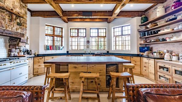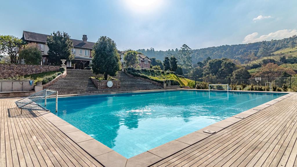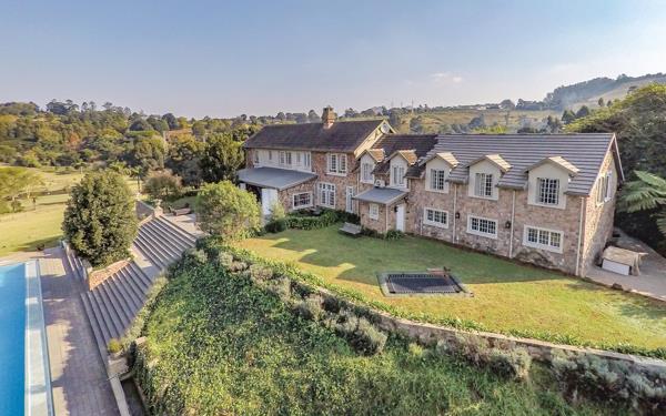 Spectacular Serenity . The sweeping entrance leads through the lush green pastures and lake and up to the magnificent main residence . Beautifully stone clad exterior with classic stone flooring downstairs making for a contemporary farmhouse feel. A hearty fireplace warms the lounge and living areas. A superb open plan kitchen awaits the gourmet cook in you. Relax at the bar or adjacent dining area with uniquely beautiful windows. Yellowstone comes to mind Upstairs the spacious 4 bedrooms with en suites have the use of a large living area for private relaxation. A fifth bedroom on the lower level is the perfect guest suite. The second home set higher up is immaculately tiled throughout. 4 bedrooms plus a separate flat above the garage.