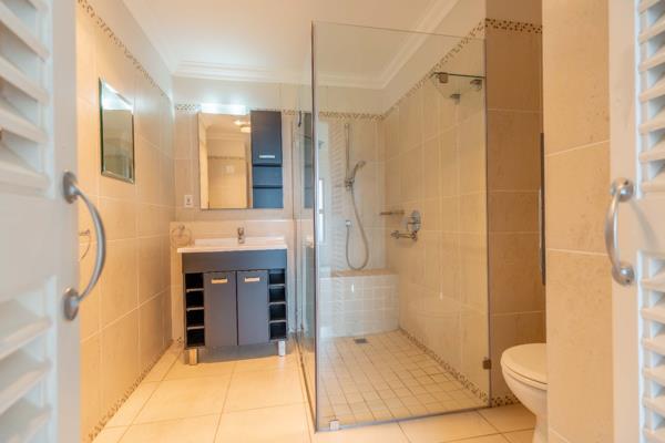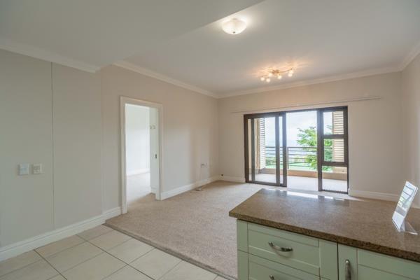 2 Modern en-suite bathrooms, one with bath and shower, the other with shower. A spacious open-plan lounge, dining, and kitchen area with stunning views of the Valley of a Thousand Hills from the balcony. The balcony has wooden shutters.