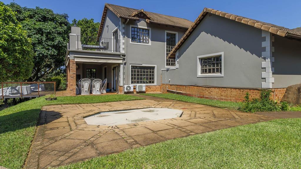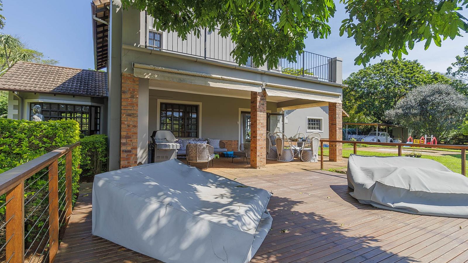 Enjoy a beautiful wooden deck that overlooks a small pool and lush greenery, the perfect space to unwind and take in the tranquil surroundings.