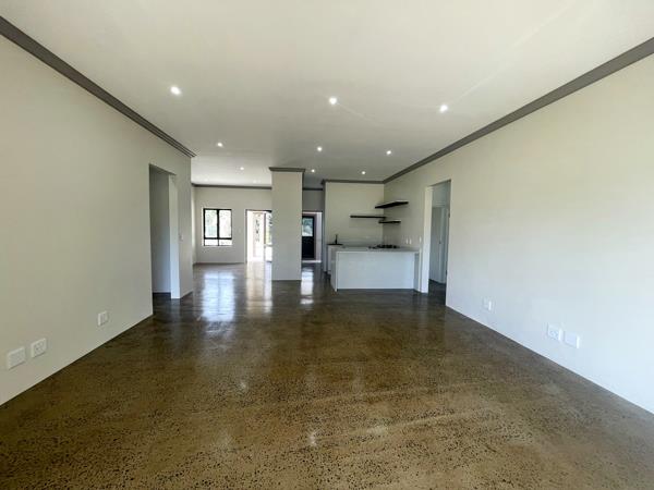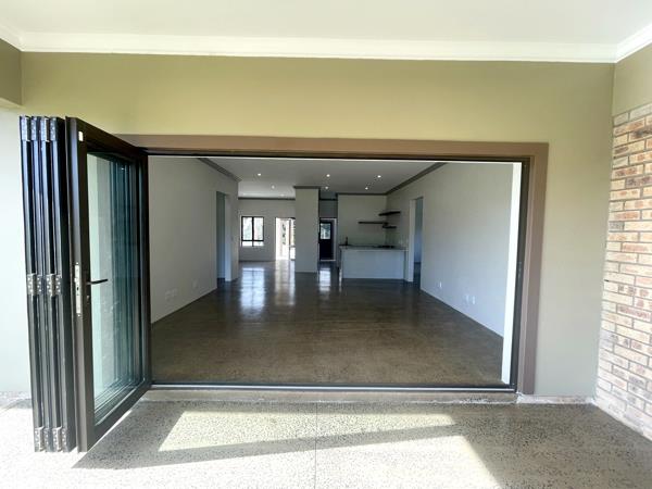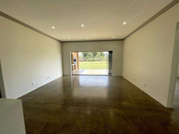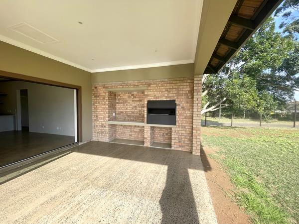 The Caesarstone kitchen equipped with an under-counter oven and gas hob, combines functionality with contemporary design and the open floor plan allows for a seamless flow through to the spacious lounge and patio with built-in gas braai.