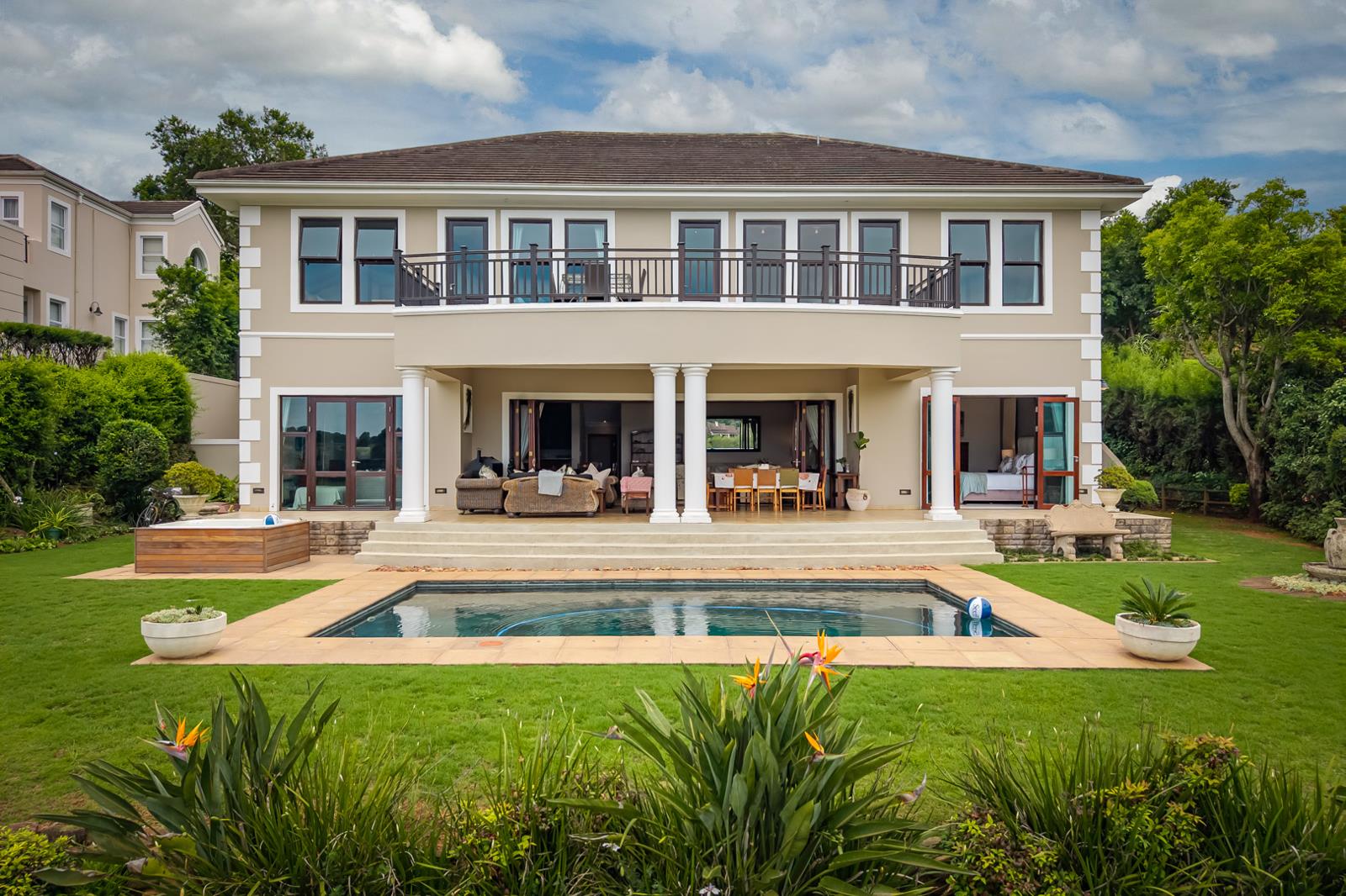This stunning property offers a lifestyle of serene elegance, perfectly positioned within the highly sought-after Langford Estate. A key feature of this home is the constant connection to its surroundings the views from every room in the house are simply breathtaking, providing a private, ever-changing backdrop of natural beauty. Your approach to the home is immediately inviting. Stairs gently lead you down to a pair of large double doors, opening into a truly grand entrance. Before entering, you''ll appreciate the calming effect of the exterior space, where a beautiful koi pond with gently flowing water creates a tranquil atmospherea perfect welcome for residents and guests alike. Once inside, the entrance hall is light and spacious, acting as the heart of the home. Its unique design offers a clear separation of function: a staircase leads upward to the private bedroom section, while another set of stairs descends to the expansive living and entertainment area. This thoughtful layout ensures both privacy and an ideal setting for hosting and relaxation are effortlessly achieved. As you descend the stairs to the expansive, open-plan downstairs living area, you are instantly captivated by the glorious view that awaits. Sunlight streams through the large openings, illuminating a space designed for sophisticated living and effortless entertaining. The culinary heart of the home is a beautifully appointed kitchen, featuring elegant granite tops and ample workspace. Functionality is paramount, with a separate scullery and laundry area cleverly tucked away. The kitchen flows directly into the dining area, setting the stage for memorable meals. Adjoining this space is a large, comfortable lounge centered around a beautiful fireplace, perfect for cozy winter evenings, as well as a separate, spacious TV lounge, offering flexibility for family relaxation. Making entertaining truly effortless is the conversational bar area, positioned just off the kitchen and perfectly integrated into the main living space. The entire open-plan area is designed to merge seamlessly with the magnificent exterior through stunning fold-back doors. These doors fully retract, leading you onto a magnificent covered verandah. This intentional design creates a fluid transition, inviting the outside in and turning the verandah into an extension of the primary living space, ideal for year-round enjoyment. The verandah, in turn, flows directly out to the sparkling water of the pool, offering instant refreshment on hot summer days. Adjacent to the pool area, a luxurious jacuzzi beckons, providing a perfect spot to sit back, relax, and admire the incredible, wide-ranging views in complete privacy. Beyond the main living areas, the home offers thoughtfully arranged and luxurious accommodations. Completing the lower level is a convenient guest bathroom and two superb bedroom suites. The first is a large, light-filled bedroom with an en-suite bathroom. Perfect for extended family or a premium guest suite, this room offers gorgeous views and immediate access to the lower level''s amenities. Additionally, there is another smaller, private en-suite bedroom downstairs. Ascending the staircase to the upper level reveals the main family sanctuary. Here, you will find three spacious bedrooms, each enjoying the privacy of its own en-suite bathroom. All three bedrooms open out onto a large balcony, ensuring that every occupant can step out and appreciate the exceptional views the property is known for. Also located upstairs is a substantial study. This dedicated workspace is illuminated and airy, and thoughtfully opens onto its own covered outdoor area, offering a peaceful space for work or contemplation. This property is truly one of a kind, and being situated in the incredible Langford Estate makes it even more appealing. The estate offers a lifestyle rich in recreation and community, featuring a well-appointed Clubhouse, two sparkling swimming pools, and quality tennis courts. Furthermore, residents benefit from exclusive access to Camp Orchids, allowing for beautiful scenic walks. After enjoying the fresh air and stunning trails, you can indulge in breakfast or lunch at the lovely restaurant, completing the picture of convenience and luxury. This exceptional home combines breathtaking views, luxurious design, and an unbeatable location within a highly desirable estate, promising an unparalleled living experience. Please contact Natasha Brown for a private viewing of this exceptional property.