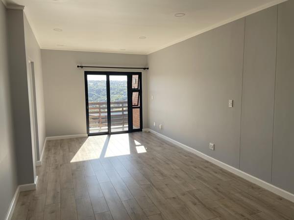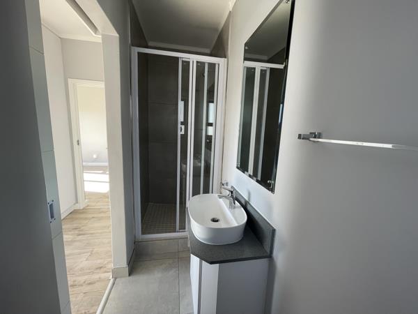 This stylish second-floor apartment features open-plan living spaces with elegant laminate flooring throughout. It offers two spacious bedrooms with built-in cupboards, including a main bedroom with a private en-suite (shower), plus a second bathroom with a convenient shower-over-bath layout.