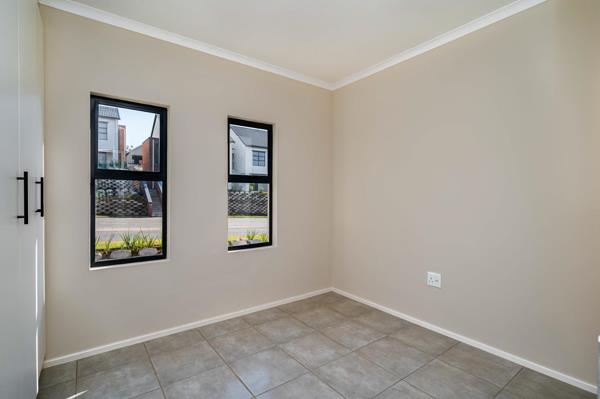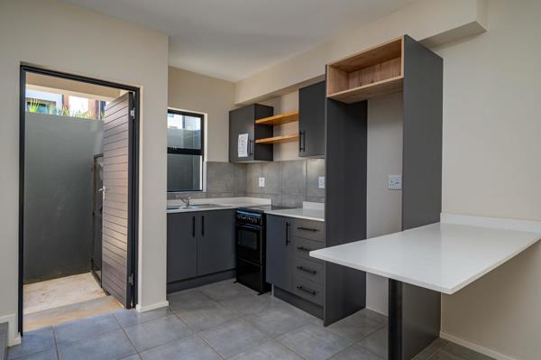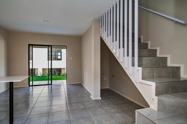 Experience modern living in the popular 2-bedroom duplexes at Kings Gate Estate. Set in pairs, these units feature your own private garden and are thoughtfully designed to maximize both space and sunlight. The open-plan downstairs living area seamlessly connects to a private patio and garden a perfect extension of your living space which can be fenced to accommodate a small dog. The well-appointed kitchen includes a standard gas hob, electric oven, and a convenient courtyard with a drying line. Upstairs, the landing provides ample storage and a useful work nook, leading to two beautiful bedrooms, each with built-in cupboards and bright, large aluminum windows. The contemporary bathroom features a standard shower. Benefit from lower utility bills with the included gas geyser.