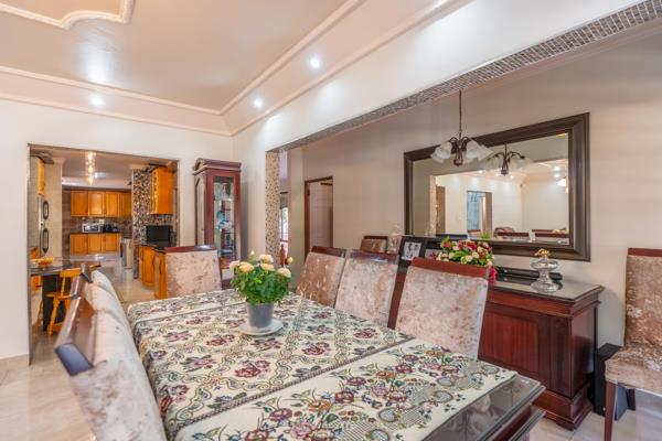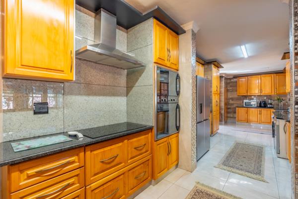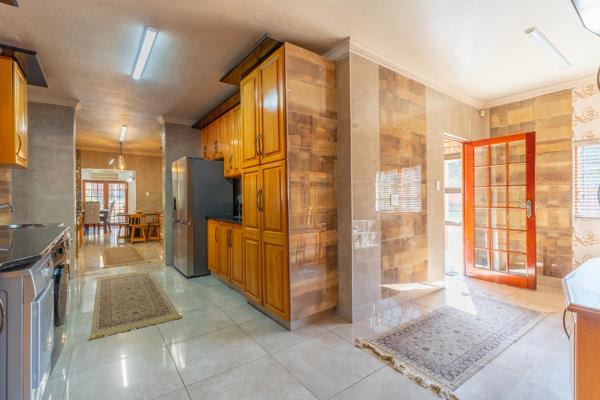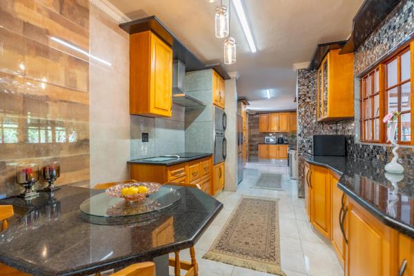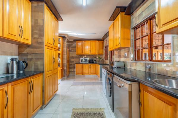 For the cooking enthusiast, the kitchen boasts large solid wood and granite countertop cupboards, a double oven, an electric hob and extractor, complete with a pantry and breakfast nook. The scullery is more like a second kitchen, with built in cupboards and a gas stove. Offering loads of secure parking space, including a double garage and a carport, as well as staff accommodation, this home ensures convenience and peace of mind. The property is armed with an electric fence, motorised gate, and security cameras.