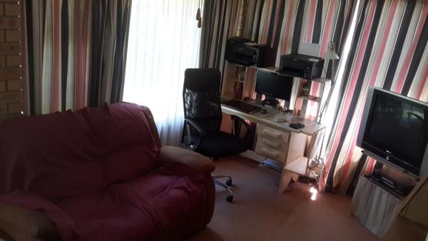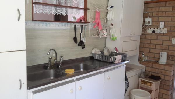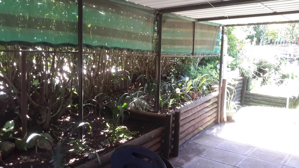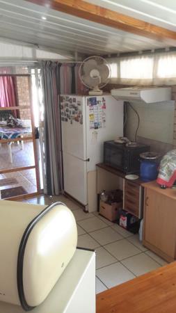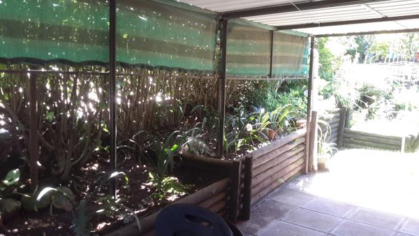 It comprises 2 large bedrooms, 2 bathrooms of which one is en-suite. It has a fitted kitchen, electric stove with an extractor fan and a breakfast nook. It has a sunroomworkroom, an entertainment area, a covered carport and a jojo tank to catch rainwater. The floors are carpeted, and some areas have slasto floors.