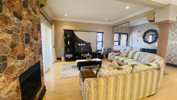 What a delight when you enter this stunning, modern, 361sqm home with laminated flooring and comfortable open plan living. Light, bright with character and charm throughout. The main lounge, with a gas fireplace is spacious and open plan to dining area and kitchen, with glass doors opening out to the luxurious patio, which runs the length of the house. Caesar stone kitchen tops with plenty cupboards and a separate scullery, plumbed for 3 appliances. Direct access from the double auto garages to the scullery.