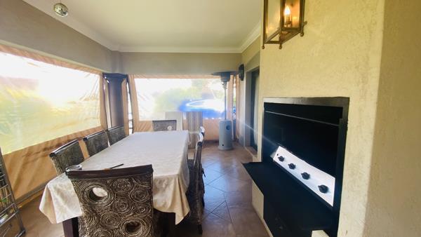 Upstairs are all 4 Bedrooms and 3 Bathrooms. All flooring is tiling, with doors leading out to the long upstairs balcony. The 4th Bedroom has its own outside entrance and kitchen and shower en-suite - great for extended family/ visitors! Bedrooms are well proportioned and have ceiling fans and air-conditioned. Bathrooms are modern and well appointed! Main Bedroom has a large Bathroom en-suite! Lovely home for entertaining as patio has a built-in gas braai. Lovely, neat level garden. Cats and Dogs allowed too! Set in a secure estate, close to all amenities and schools.