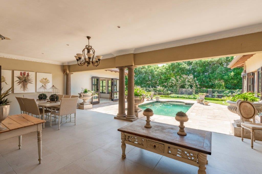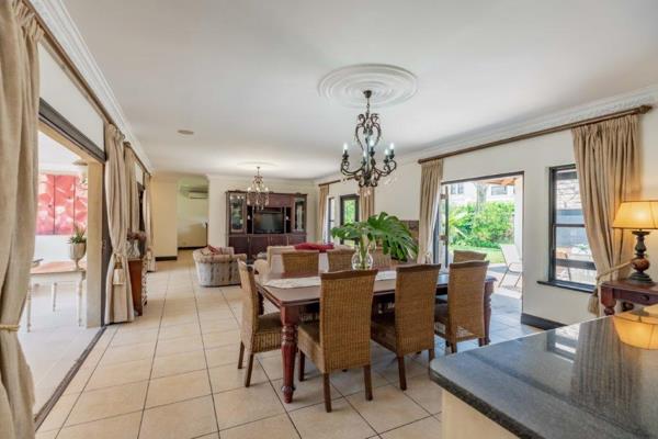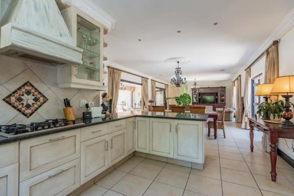 This beautifully styled single-level 4-bedroom home, perfectly positioned within the sought-after Plantations Estate, is designed for privacy, sunshine, and effortless entertaining. A welcoming entrance opens into expansive open-plan dining and lounge areas, complete with a gas fireplace ideal for year-round comfort. Double doors and stackable glass doors create a seamless connection between the living areas and the outdoor entertainment spaces, allowing natural light to pour in and linking the heart of the home to the central swimming pool and covered patio. The homes layout has been thoughtfully designed for flow and privacy, with bedroom wings positioned on either side of the living areas. Two bedrooms share a full family bathroom and are complemented by a beautifully appointed built-in pub a feature space for relaxed gatherings. Across the home, the luxurious main suite offers direct access to the pool, a spacious walk-through dressing area, and a modern full en-suite bathroom. A fourth bedroom, with its own shower en-suite, provides an ideal guest suite or space for a larger family. The open-plan kitchen is a true focal point light, bright, and practical, with generous counter space, abundant cabinetry, a gas hob, an eye-level oven, and filtered water. A separate scullery conveniently connects to the automated double garage for easy access.