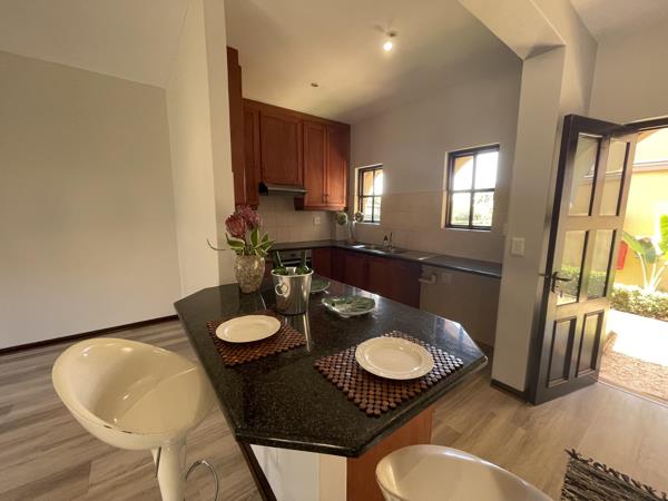 The modern kitchen offers an under counter oven, glass hob, granite countertops, breakfast island, ample cupboard space and space for two appliances.