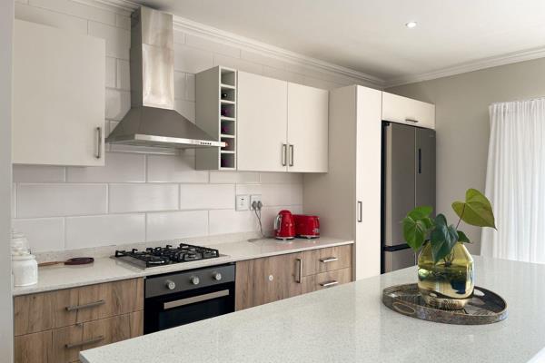 The kitchen is custom-built with top end oven/hob/extractor and breakfast bar/island with extra cupboards. There are 2 large bedrooms, a beautiful ensuite bathroom with his and hers basins and a family bathroom. Ample cupboard space with built in cupboards in both bedrooms, linen cupboards in the passage area and your own personal external store room!