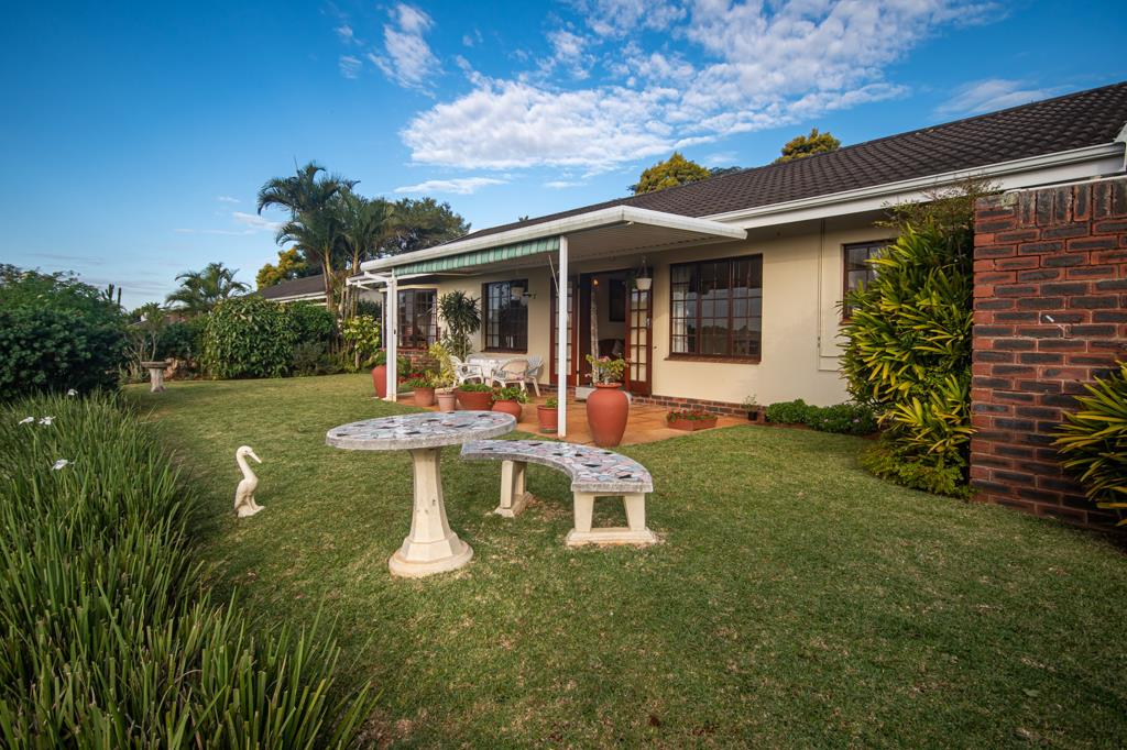 If youre searching for peace and tranquility, this property is calling your name. From the moment you enter through the electric gates, youre welcomed into a beautifully maintained estate with a sense of calm and security. A neat driveway leads you to a single garage, with additional parking for at least two more vehicles. Step through the entrance hall and youll find a separate lounge fitted with an overhead fanan inviting space for relaxationalongside a spacious dining room. The lounge flows onto an undercover patio overlooking a lush conservancy greenbelt. Whether you choose to unwind in the level garden or take in the view from the patio, this serene setting is the perfect place to slow down and enjoy nature, with storm blinds providing comfort during Hillcrests well-known misty or rainy days. The fitted kitchen is conveniently positioned near the dining room for easy meal service and opens into a private courtyard with direct access to the garage, making unloading groceries effortless.