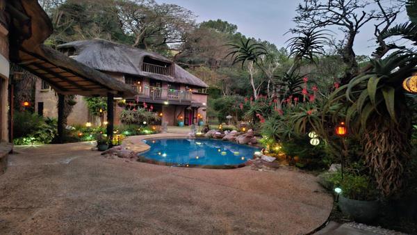 Additional features include a studio with its own kitchen and bathroom, and a spacious 1-bedroom cottage accessible via a beautiful wooden staircase. The cottage boasts an open-plan lounge with unique wooden strip ceiling, kitchen, and bathroom, with stairs leading to a grand master bedroom and its own balcony with gorgeous views over the garden and pool.