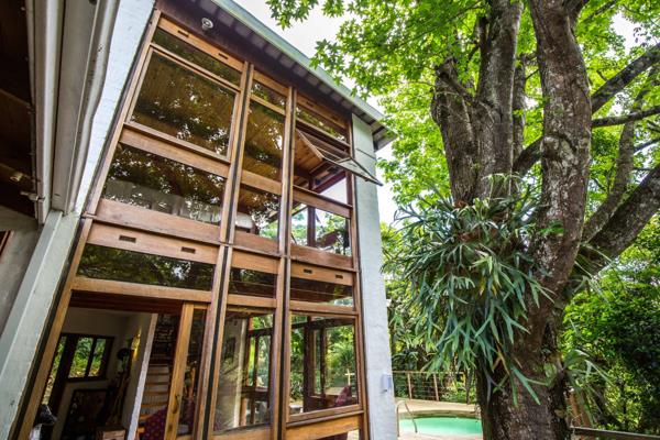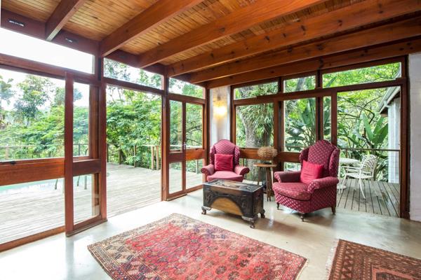 Original Oasis . Birdsong greets you as you arrive at this unique residence bordering the nature reserve. Akin to a holiday lodge with its tranquil ambiance, immersed in the forest. The dreamy deck with splash pool will captivate you. Upstairs the light and bright main bedroom enjoys wonderful views. The living area is relaxed and open plan. A fireplace adds to the warmth. Bonus is the one bedroomed private cottage for rental income. The host of opportunities are available for the gym room located on the lowest level.