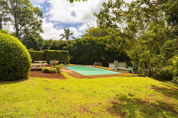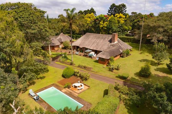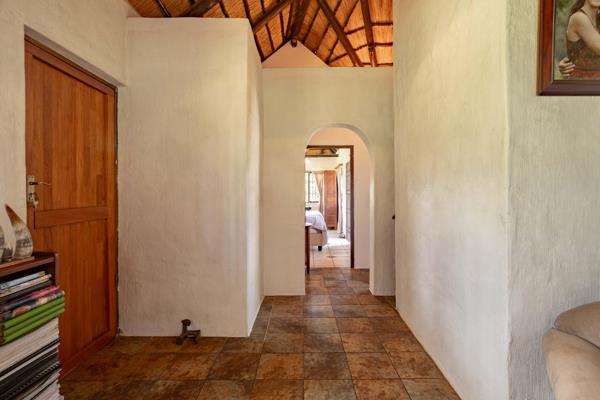 This charming property offers spacious and flexible accommodation within a tranquil setting. Set on vast, gently sloping grounds, it boasts breathtaking, uninterrupted views over the lush gorge and a glimpse of the sea beyond. The garden is populated with exquisite trees, adding to the ambiance of a countryside escape. The main residence features an extra-height thatched roof, recently rethatched, with the added benefit of regulating the internal temperature. The home exudes character whilst featuring good-sized rooms and a seamless flow between spaces. The semi-open plan lounge, dining areas, and two bedrooms open onto a paved patio, creating the perfect spot for relaxation while soaking in the stunning surroundings. A well-appointed scullery and kitchen are accessible from both ends of the living areas, providing convenience and ease of access. The home includes four bedrooms, with the main bedroom offering an ensuite bathroom for comfort and privacy. Elegant ball and claw slipper baths, add a touch of luxury to the spacious full bathrooms.