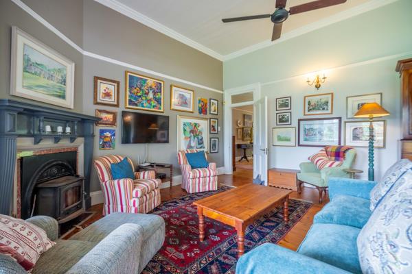 As you step into this residence, you are greeted by an expansive hallway adorned with gleaming wooden floors and lofty ceilings. The living areas exude character and charm, featuring fireplaces in both the lounge and study. The kitchen is a delight, centered around a picturesque farm-style fireplace, creating a warm and inviting atmosphere.