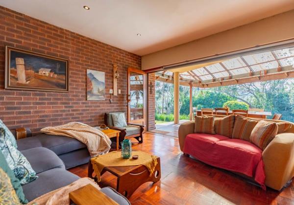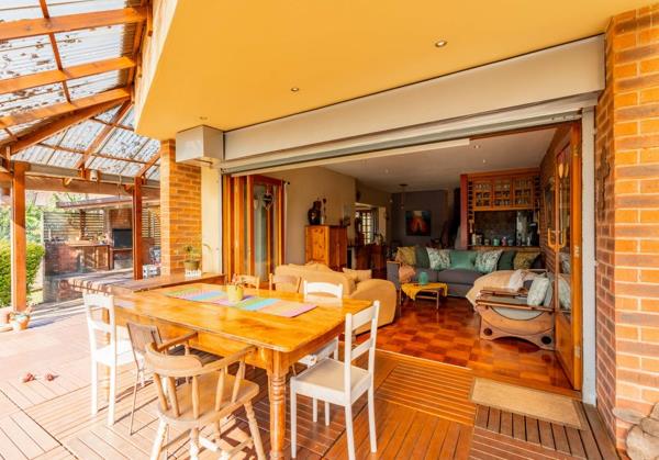 The dining area flows out to a leafy back garden, while the entertainment deck is ideal for gatherings, complete with a built-in braai area that invites weekend feasts, sunset dinners, and easy outdoor living.