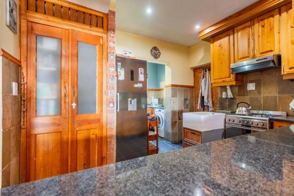 The dining room is spacious and opens up to the back garden, ideal for entertaining or relaxed family meals. The kitchen is both functional and full of character, featuring granite countertops, charming oregan pine cupboards, a freestanding gas stove, a large pantry cupboard, and a separate scullery.