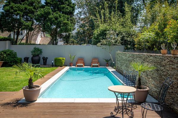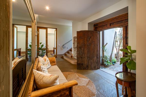 This magazine-style home exudes timeless elegance and sophistication, offering top-class finishes and an unmistakable Cape Town flair reminiscent of Franschhoek. Every element has been carefully curated, from the front door sourced from a French chapel in the South of France to the grand double-volume entrance hall with its sweeping staircase, sparkling chandeliers, and a wine cellar tucked gracefully to one side. The open-plan design ensures seamless flow between living and entertainment spaces, creating a natural sense of warmth and light. The lounge features a striking natural stone wood-burning fireplace and multiple oversized French doors that flood the space with sunlight and invite the outdoors in. The kitchen is a showpiece of style and functionality, with a large central island, SMEG gas stove, high-end appliances, and designer pendant lighting, opening effortlessly to the dining area and the expansive enclosed veranda with frameless glass stacking doorsperfect for year-round entertaining. The attention to detail continues throughout, with a fully equipped scullery, staff quarters, courtyard, and direct access to extra-length double automated garages. Sustainability and comfort are prioritized with a dedicated inverter room, JoJo tanks, filtration system, pumps, and twelve solar panels. The level, landscaped garden is a tranquil retreat, complemented by a brand-new heated pool framed with stylish decking and stone cladding. Privately positioned at the top of one of the most prestigious estates on Meadow Lane, this home offers unrivalled security and breathtaking views from multiple Juliet balconies extending from the upstairs bedrooms. The upper level hosts four luxurious en-suite bedrooms with air conditioning and walk-in closets, including a magnificent main suite with a lavish open-plan bathroom, custom shoe drawers, and a large sun-soaked balcony overlooking the valley. Additional features include a second lounge or games room, a study currently used as an art room, parquet floors, cladded tiles, ducted air conditioning, underfloor heating, American shutters, and exquisite oval windows adding architectural charm.
