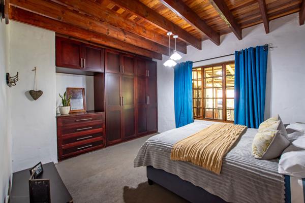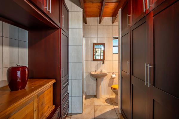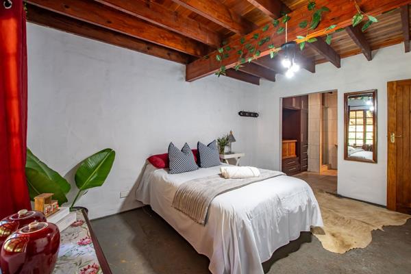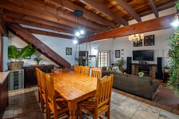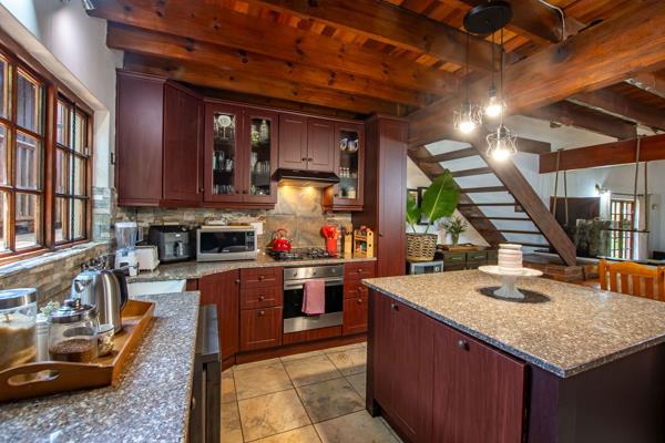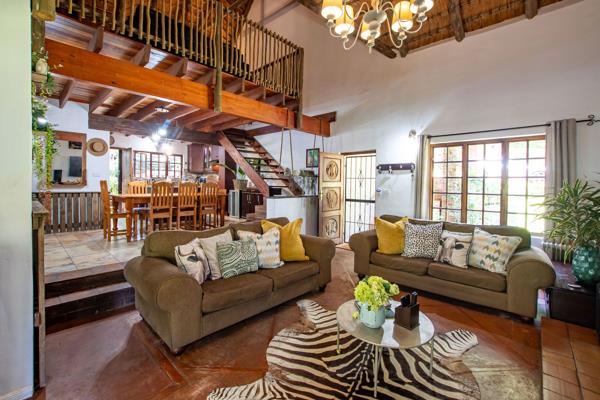 The entertainment area is a true highlight. A generous covered patio spills out onto a step-down deck overlooking the fenced pool a perfect setup for hosting birthday parties, weekend braais, or relaxed afternoon get-togethers. The garden beyond offers ample space for children to play freely, explore, and enjoy the outdoors, complete with the calming sound of a stream running through the landscaped grounds.