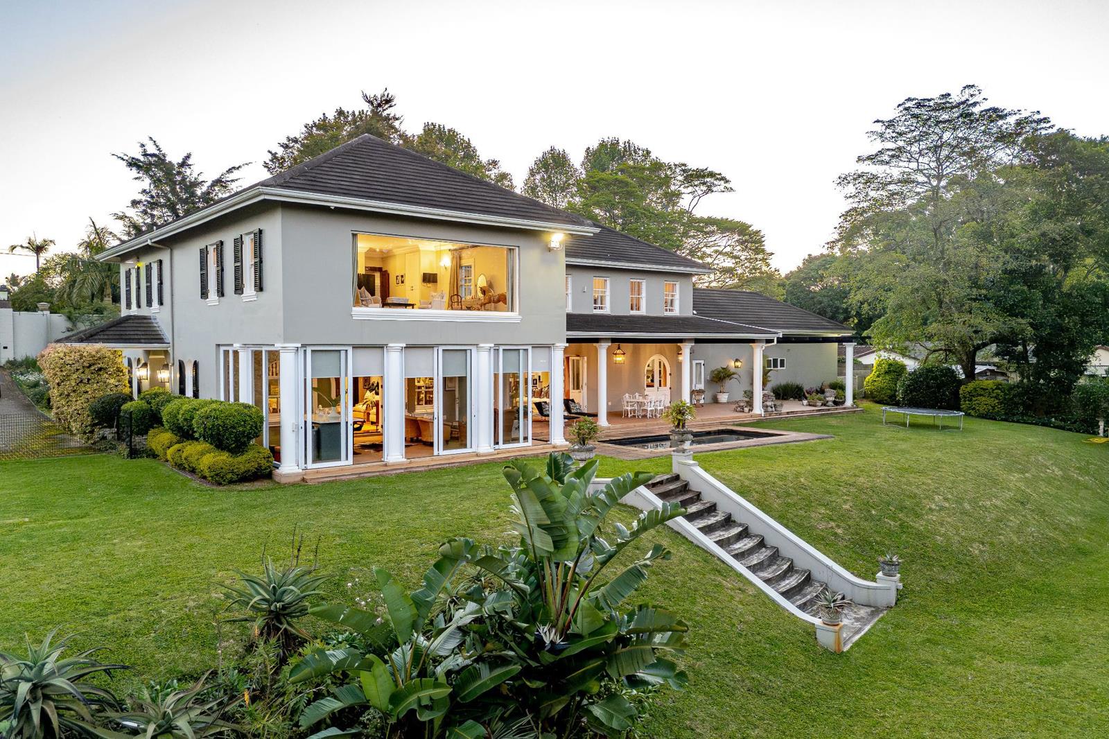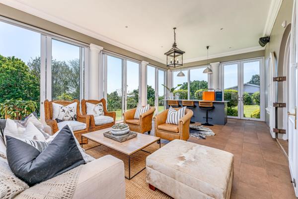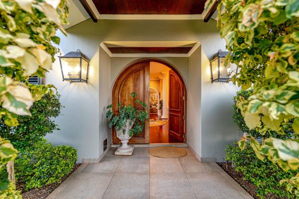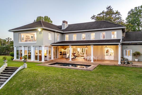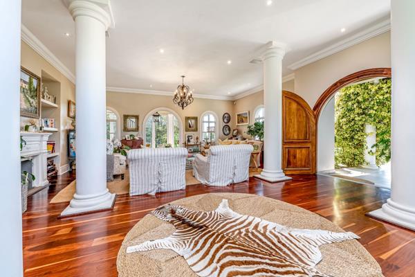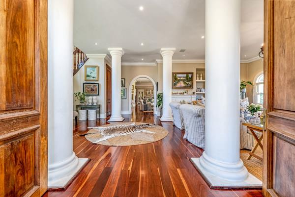 From the moment you enter, youre greeted by double-volume ceilings, a staircase with a magnificent mahogany balustrade and beautiful Rhodesian teak floors that flow seamlessly throughout the ground floor of the home - setting the tone for quality and refinement. The formal lounge shares a dual-sided fireplace and extends to a sun-drenched lounge and bar room. Glass sliding doors open onto a covered verandah fitted with a built-in gas braai, overlooking the landscaped level garden and pool - perfect for family gatherings and outdoor living.