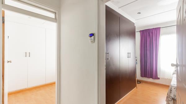 The home features 3 spacious bedrooms, all with laminate flooring, and the main bedroom is equipped with an air conditioner for added comfort. There are 1.5 bathrooms, including a guest loo downstairs. The open-plan lounge area is enhanced with modern tiles, downlights, and an air conditioner, creating a bright and inviting space. The modern kitchen boasts sleek granite countertops, a gas stove, and ample cupboard space.