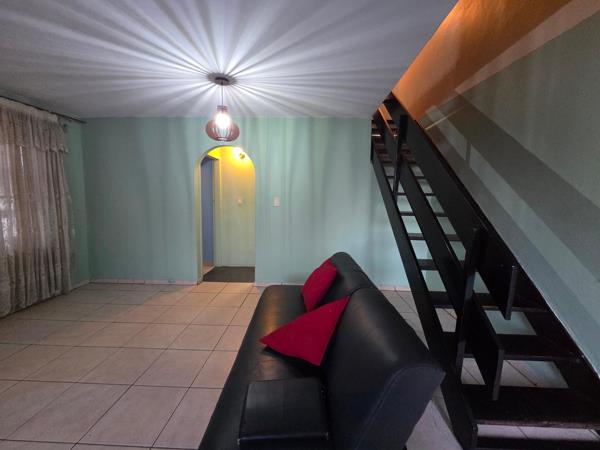 This lovely home is fully tiled throughout and offers a fitted kitchen, a guest toilet downstairs, and a fully functional bathroom upstairs. One of the bedrooms features built-in cupboards, perfect for convenient storage.