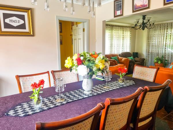 There are 4 Airconditioning systems situated in the house. A patio at the entrance hall that leads to the lounge and dinning room and a beautiful set up that flows to rest of the house which is tiled and well maintained all round. The guest room is carpeted and with a TV stand and a custom made seating designed to suit the room. The dinning room is well spaced to fit a 10 seater and ample cupboards to store your cutlery which is also custom designed.