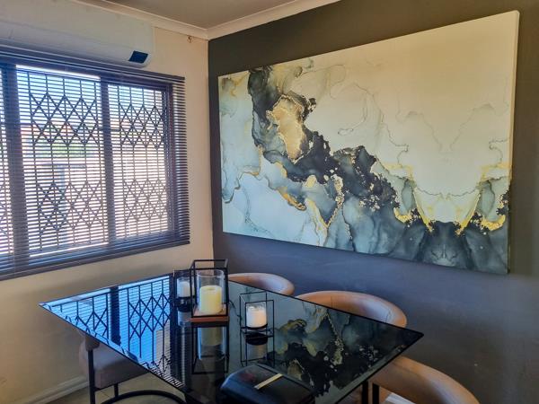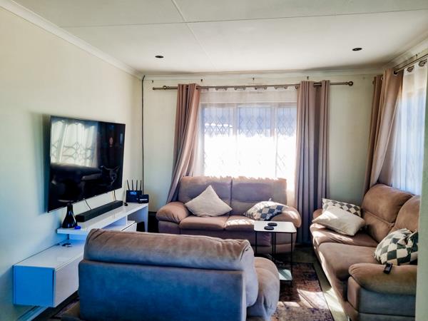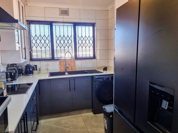 A beautiful set up of Open plan Lounge /TV Room and dining room with security gates. This flow and set up does open into the modern finished Kitchen creating ample space for movement and relaxation from the dining room to the foyer. The kitchen boasts tiled walls with a ceasarstone tops and built in oven, extractor and a hob with ample space for washing machine.