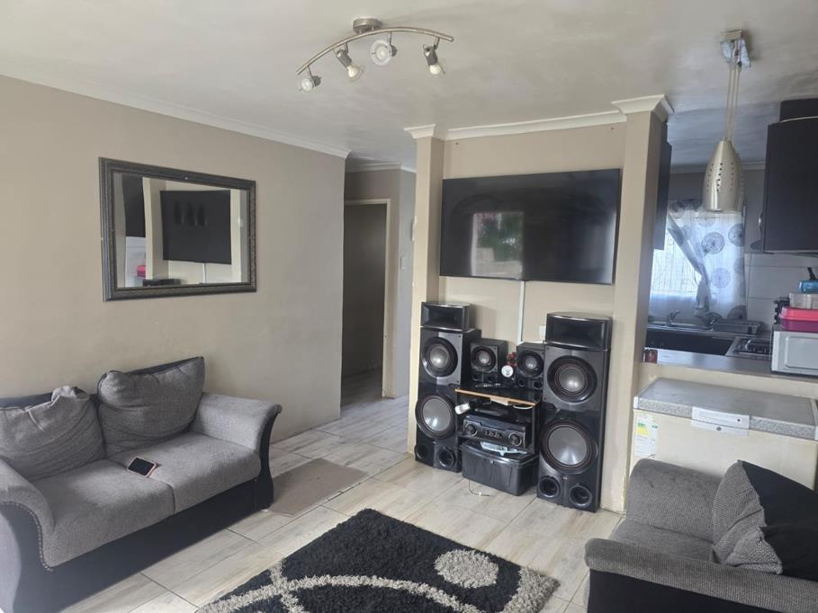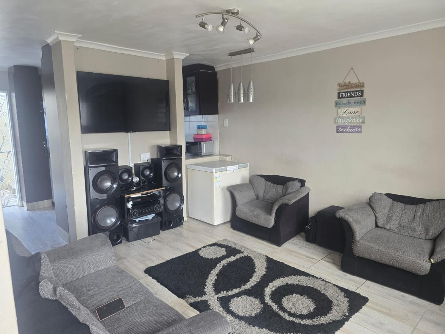 As you enter the home, you are welcomed by a modern, fully fitted kitchen that is tastefully designed and fully tiled, flowing seamlessly into a spacious and comfortable lounge area.