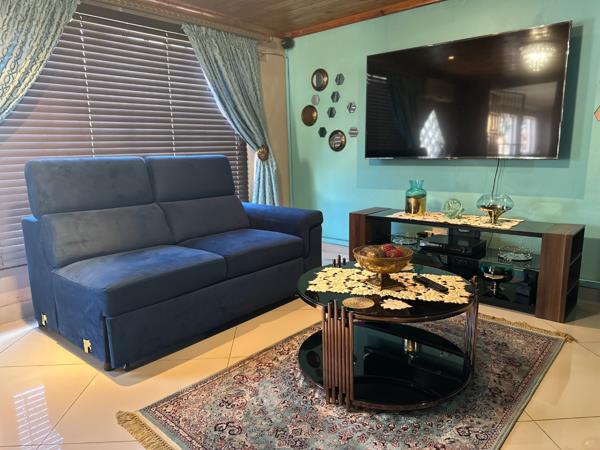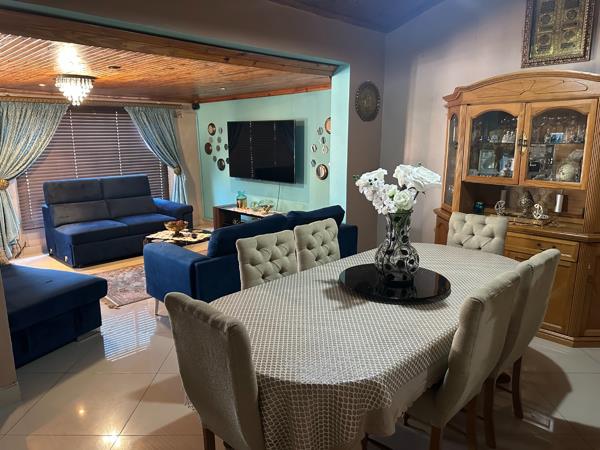 The home flows into a gorgeous lounge and dining room. The kitchen is fully fitted with built in cupboards and theres a scullery fitted with gas stove and space for a double fridge