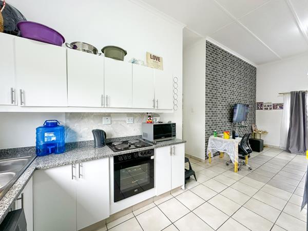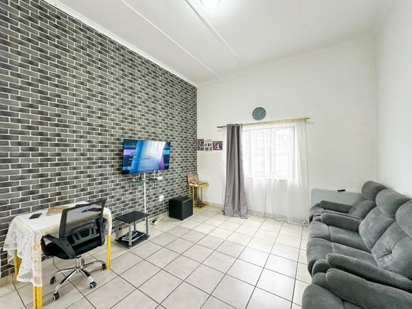 The home boasts three generously sized bedrooms, two of which include built-in cupboards. The main bedroom features an en-suite bathroom with a shower, basin, and toilet. A separate family bathroom also includes a shower, basin, and toilet. Fully tiled throughout, the property offers two parking spaces, a neatly tarred parking area, and a remote-controlled access gate for added security. Conveniently located close to all amenities.