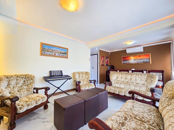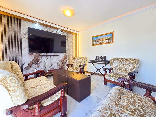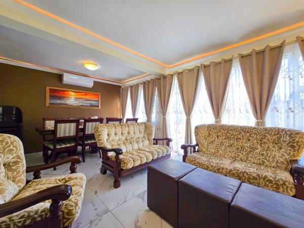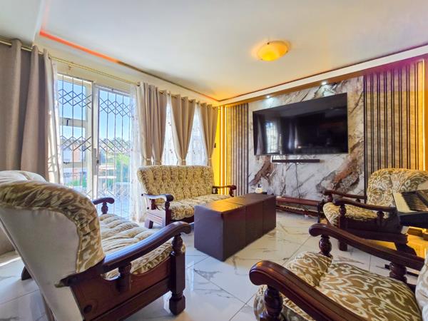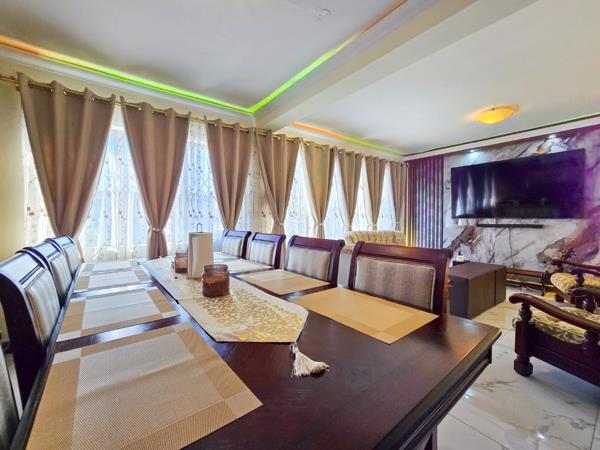 The open-plan dining and lounge area is enhanced by stylish LED strip lighting and a striking feature wall, creating a warm and inviting atmosphere. The lounge flows seamlessly into a spacious entertainment area, ideal for hosting family and friends, complete with a braai area and a view of the well-maintained garden.