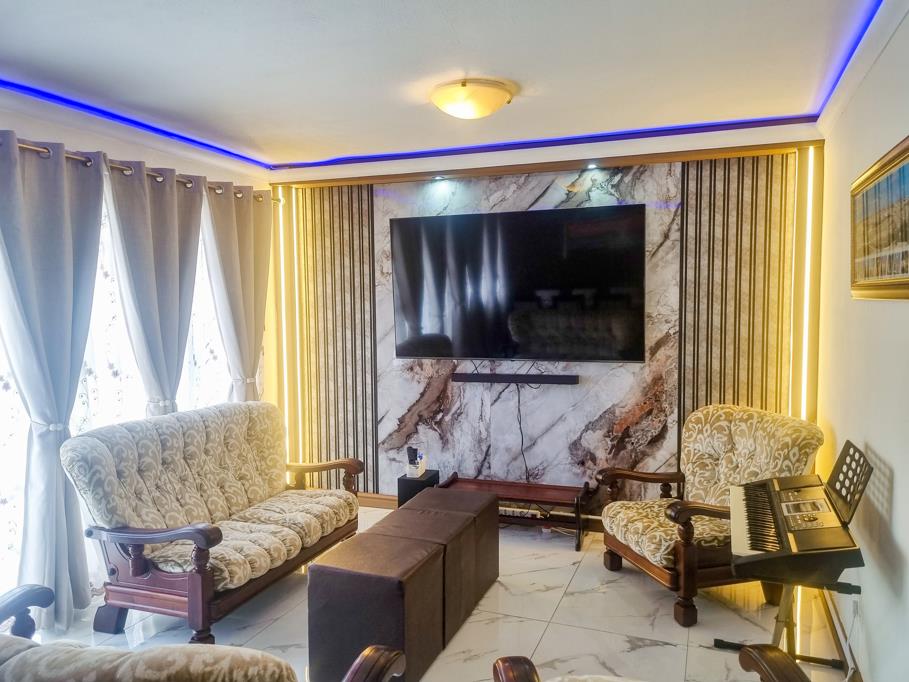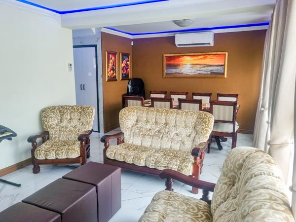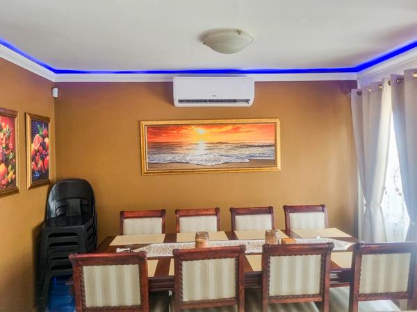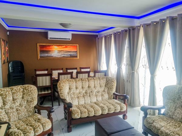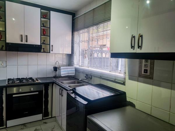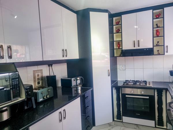 The open-plan dining and lounge area is enhanced by stylish LED strip lighting and a striking feature wall. A Sliding door with security gates that leads to the patio and entertainment area that is fitted with Kilimanjaro tiles and fully fitted grids on the braai stand. Two sets of outdoor table and chairs ideal for guests and children during family times of entertainment.