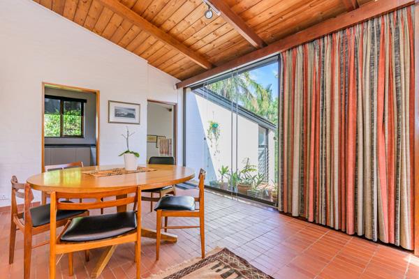 The bright dining area continues the theme of natural light and warmth, with an exposed wooden beam and planked ceiling, terracotta-style flooring, and expansive glass windows that connect seamlessly with the surrounding greenery. The home offers three comfortable bedrooms and one well-appointed bathroom, alongside a convenient guest toilet. A functional kitchen and ample storage further enhance daily living.