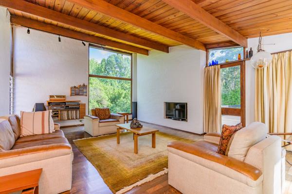 The interior boasts spacious living areas designed for comfort and natural light. The lounge features a distinctive exposed wooden beam ceiling, hardwood floors, and large windows that frame picturesque green views, creating an airy and inviting atmosphere. A built-in TV niche offers a streamlined entertainment setup, while sliding doors enhance the indoor-outdoor flow. The property also includes a dedicated study, perfect for remote work or a quiet retreat.