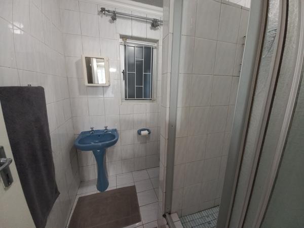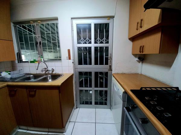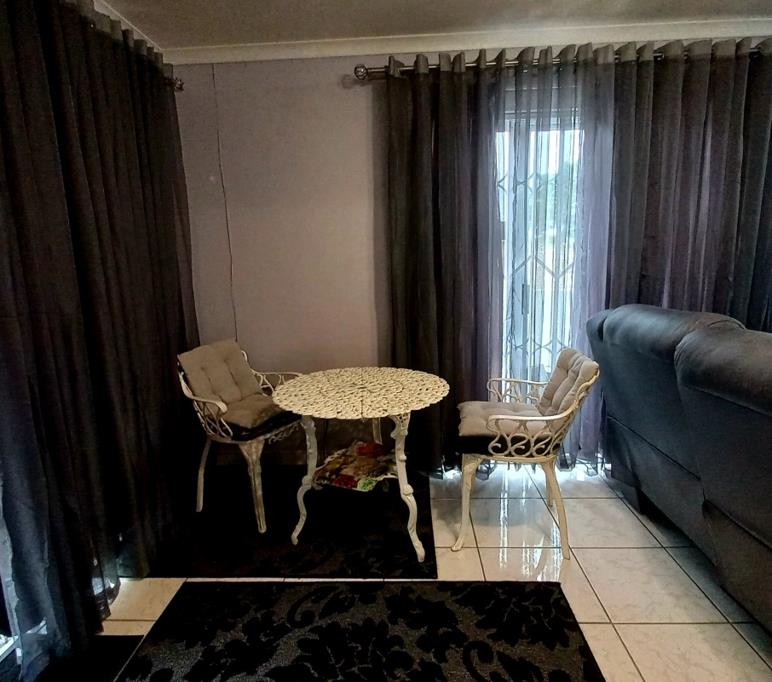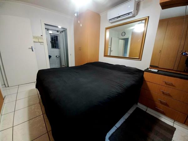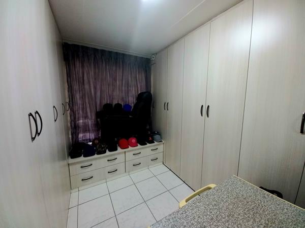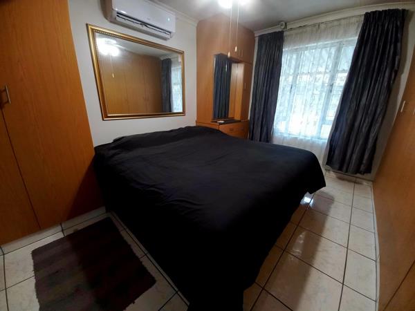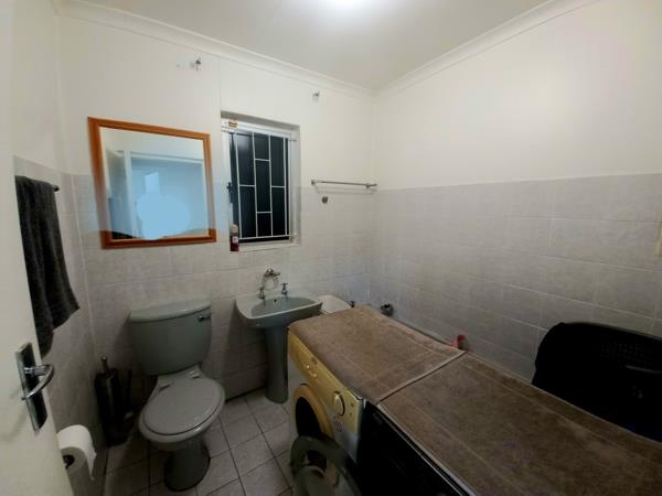 The home offers two spacious bedrooms with floor-to-ceiling cupboards, newly tiled floors, and fitted built-in cupboards. The main bedroom includes an ensuite with a shower, while a full family bathroom caters to the rest of the home.