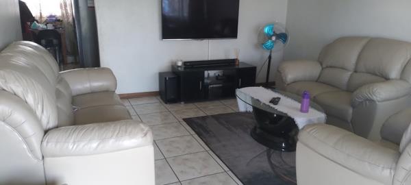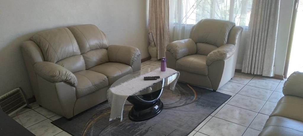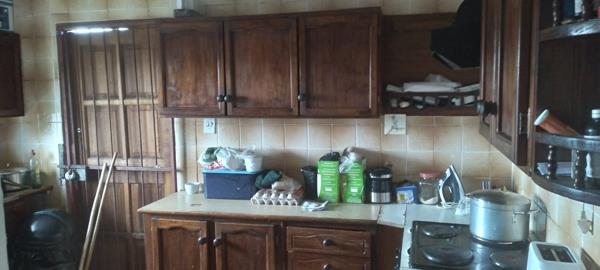 Big kitchen with wooden cupboards, dining area & spacious lounge that opens out to the verandah.