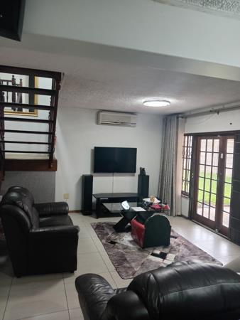 All three bedrooms are carpeted, fitted with built-in cupboards, and equipped with air conditioning. Two bedrooms also feature ceiling fans for added comfort. The main bedroom includes a private en-suite bathroom. The home includes a family bathroom with a bathtub and toilet. The open-plan lounge and dining area create a seamless flow throughout the home. The downstairs area is fully tiled, featuring both air conditioning and a ceiling fan in the lounge for optimal ventilation. The well-appointed kitchen boasts built-in cupboards, granite countertops, an oven, a glass-top stove, and an extractor fan.
