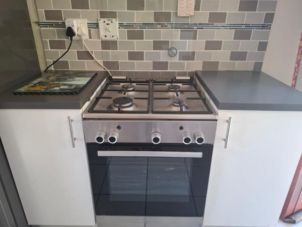 The kitchen is mode with sufficient cupboards with a fitted gas stove, oven, hob and extractor fan.