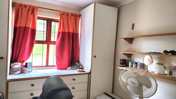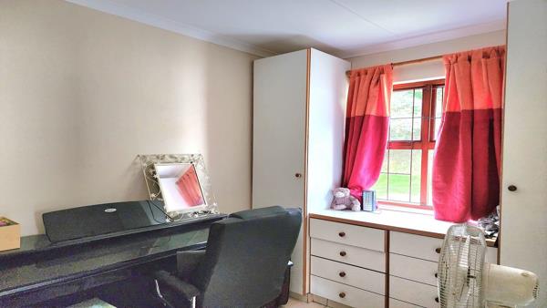 Main bedroom with full wall of built-in cupboards and en-suite (glass shower, toilet, basin)