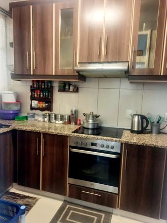 The unit features a spacious open-plan lounge and dining room, with an enclosed balcony that includes built-in cupboards and has been cleverly converted into a half bedroom. The fully fitted kitchen is modern and functional, complete with granite countertops, hob, oven and extractor fan.