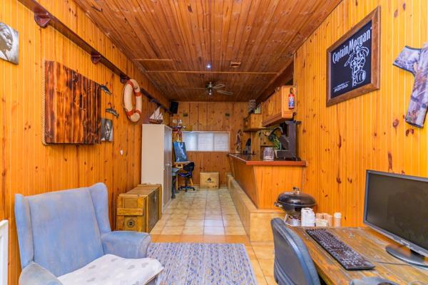Pub room for entertaining off kitchen. Built in braai area in the back garden near the kitchen for your convenience. Enclosed, covered & tiled front veranda overlooking the garden where you can watch your children and pets play.